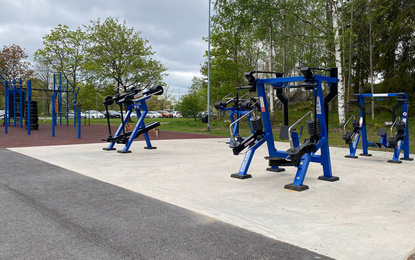Med betong och fallskyddsplattor som underlag kan alla få tillgång till utegymmet. Perfekt för rullstolsburna som kan köra ända fram och in i maskinerna och träna.