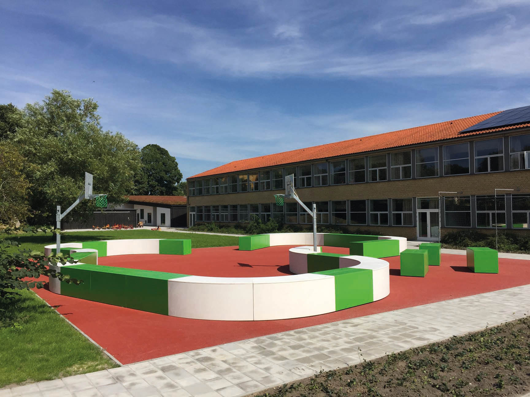 För en extra dimension kan InsideOut-arenan kompletteras med allt från basketkorgar, mål, förråd och till och med LED-belysning som automatiskt tänds vid solnedgången. De bågformade modulernas asymmetriska utformning öppnar upp för kreativ användning och ger arenan fler funktioner än en traditionell sportplats.
