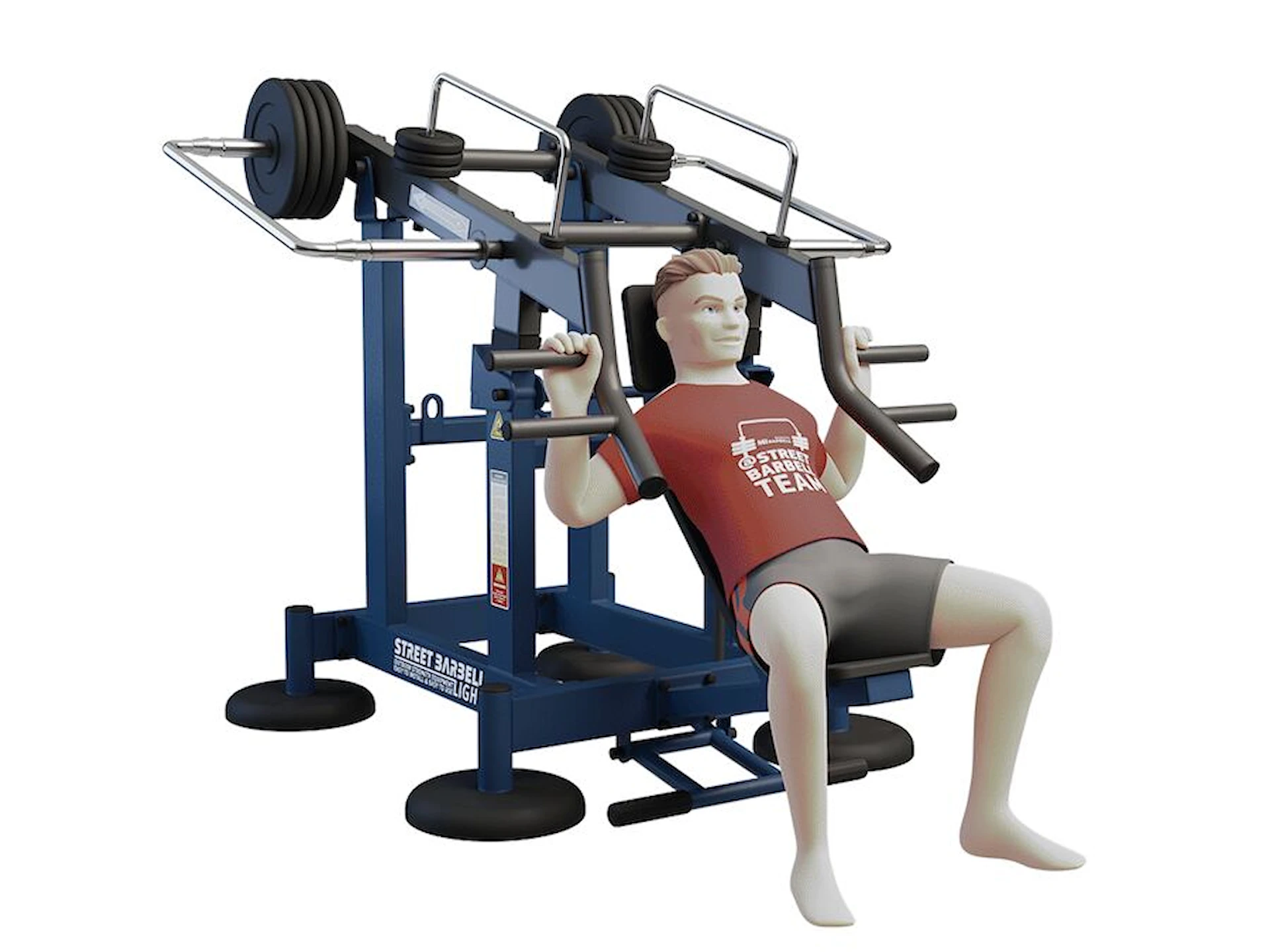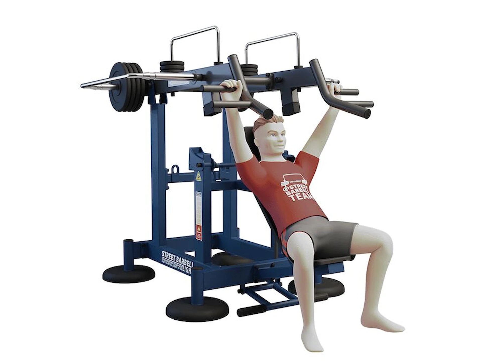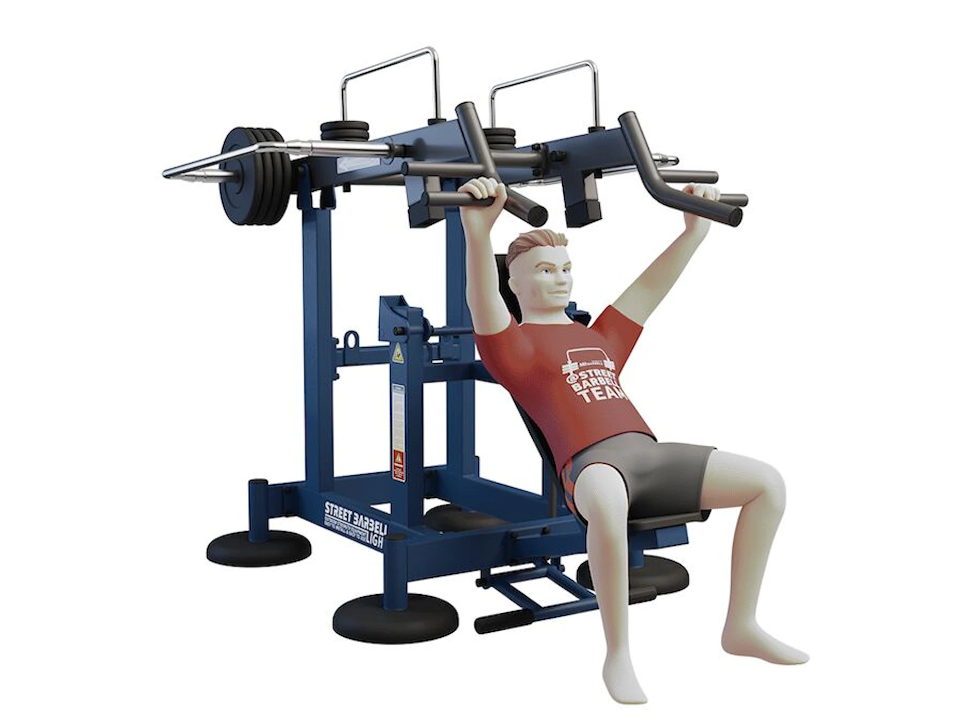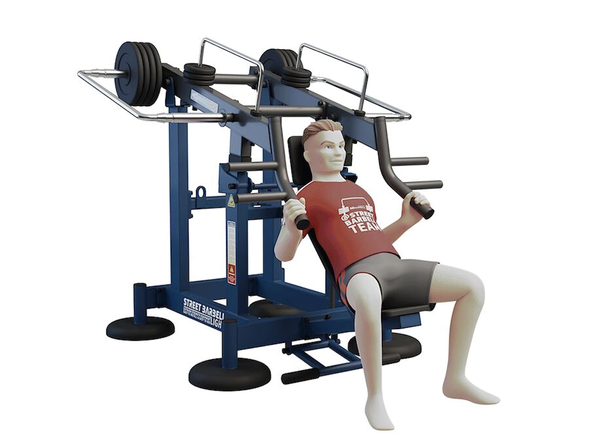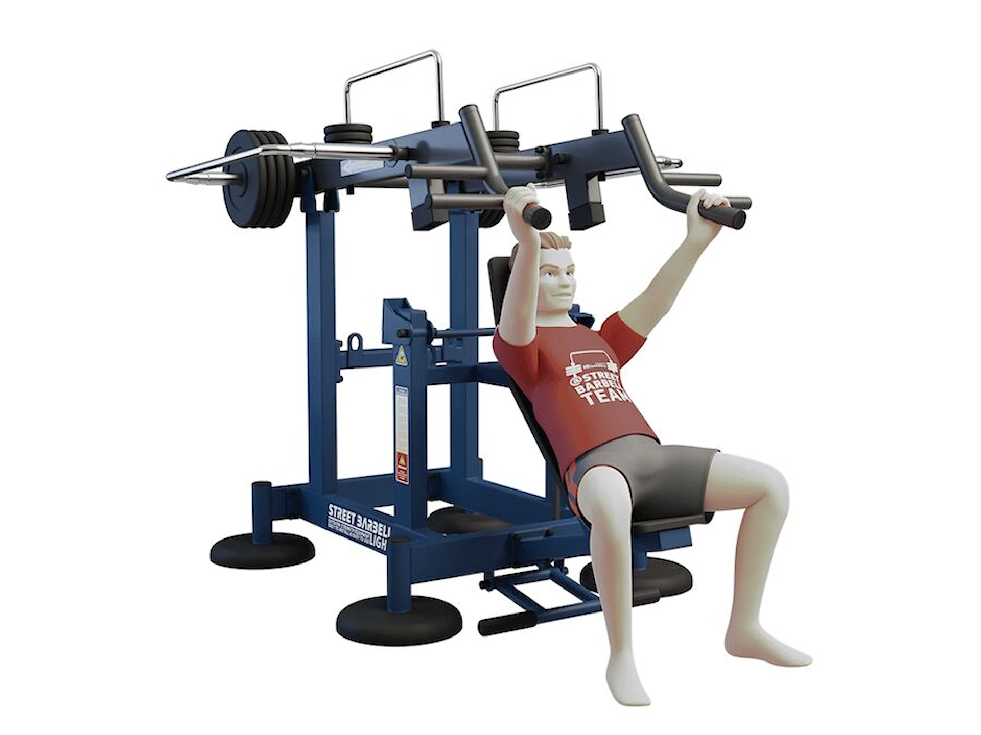 Med hjälp av QR-koder och tydliga instruktioner på varje maskin får utövaren tips och övningsexempel för att träna rätt. På denna träningsmaskin kan du köra bröstpress-övningar vilket även tränar biceps och axlar. Åtta stora gummivikter och sex små gummivikter, ger en maxlast på 130 kg. Standardfärgen är blå RAL 5010. Vid beställning av minst 6 maskiner får du fritt färgval.