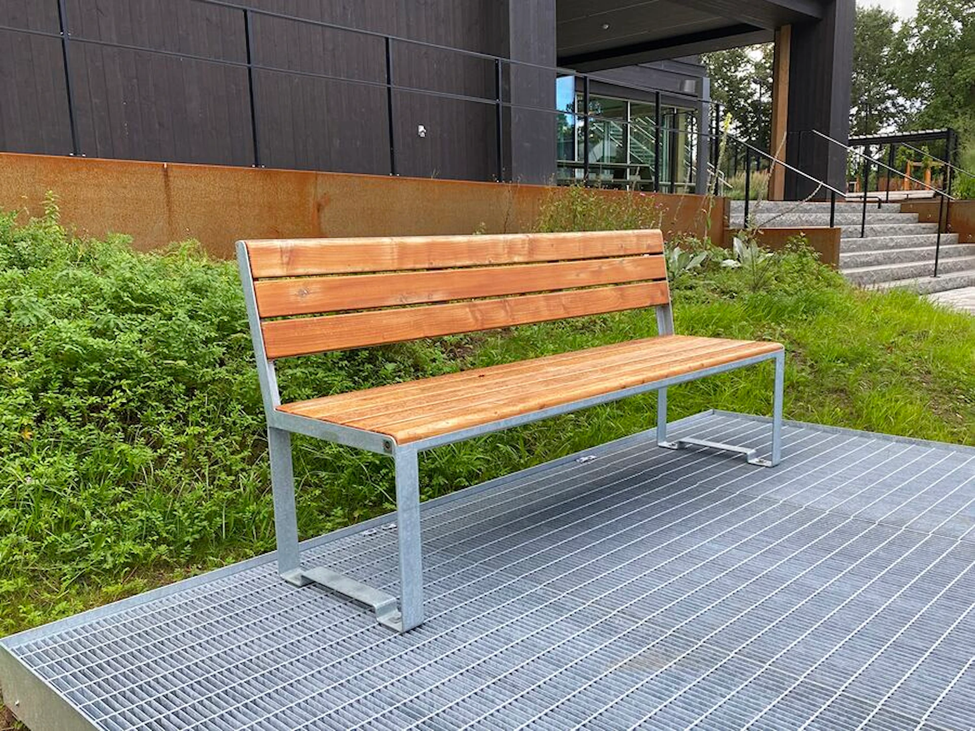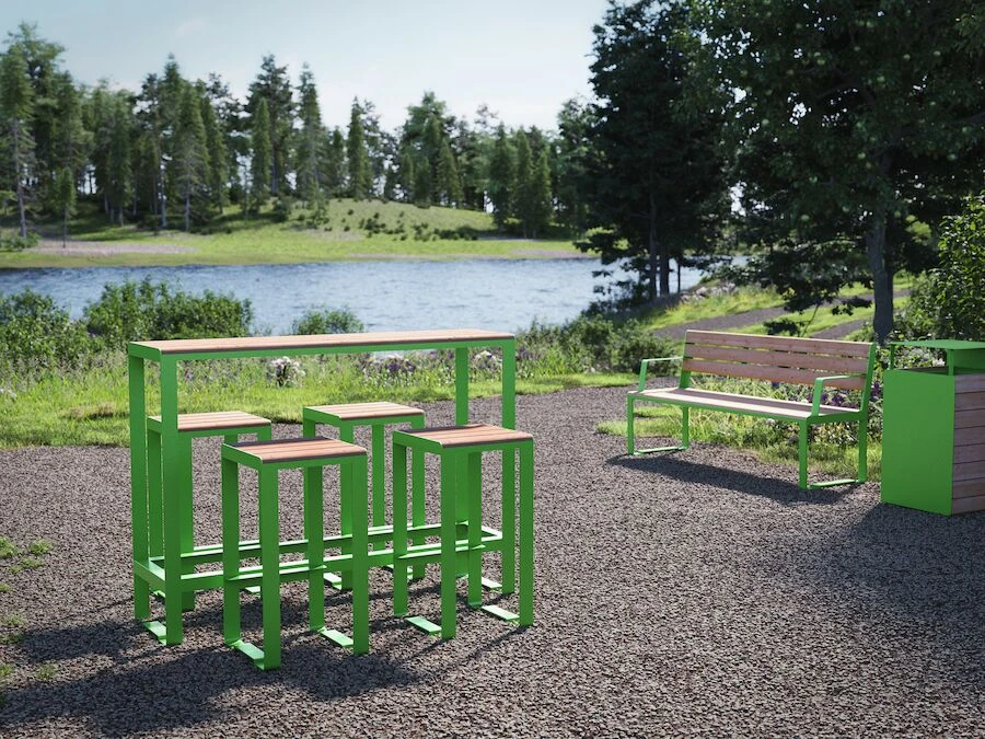 Komplettera med cykelställ och papperskorg för att främja miljötänket. Denna parksoffa har extra högt ryggstöd och finns även med armstöd.